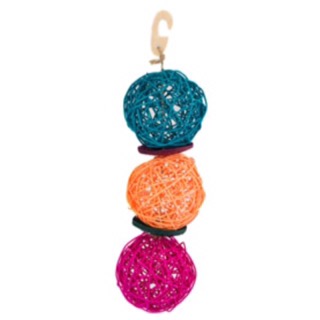 - A trio of brightly coloured willow chew balls interspersed with brightly coloured coconut shell spacers.