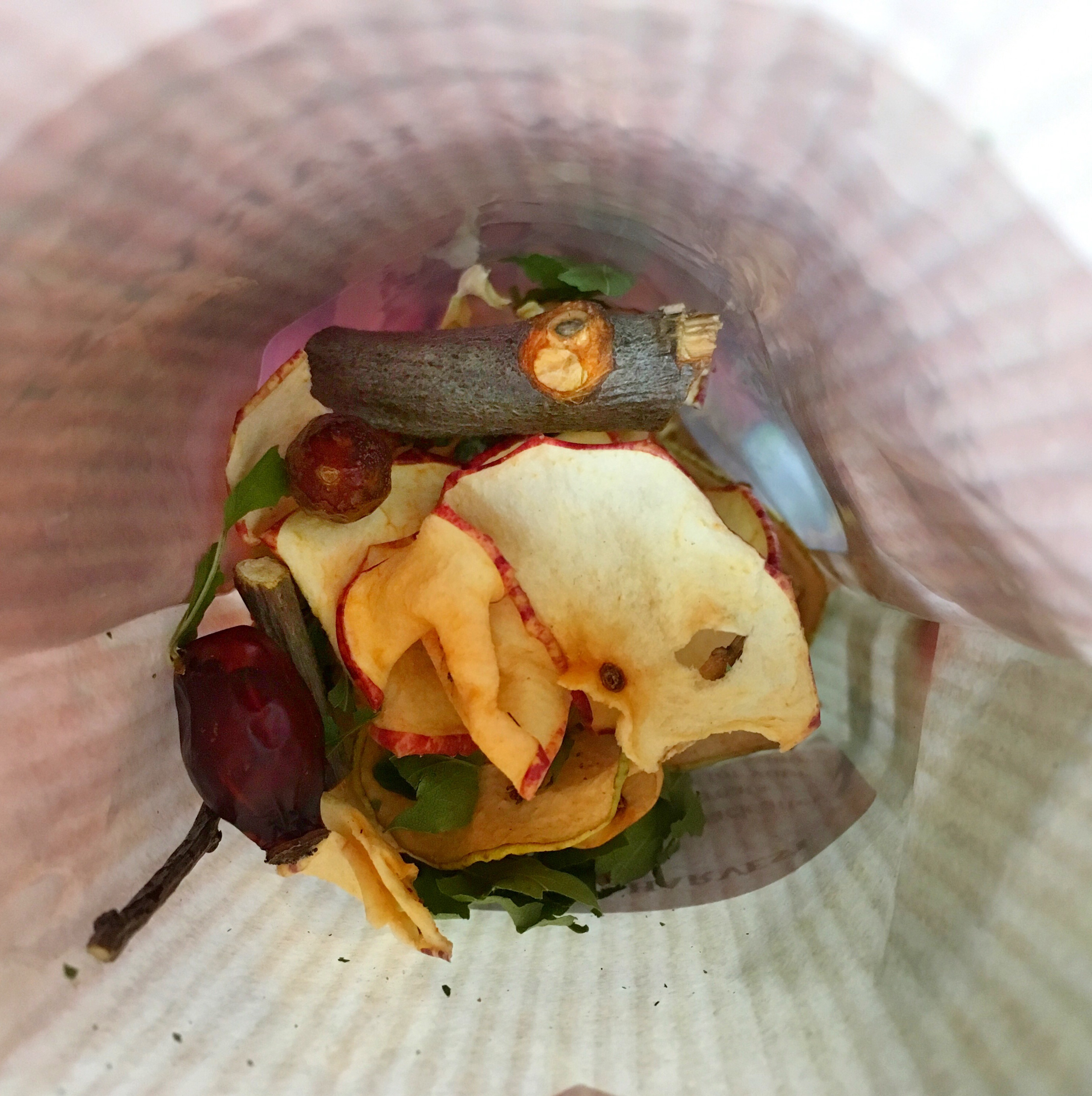 - Dehydrated apples, pears, rosehips, hawthorn lengths, hawthorn leaves and elderberry.