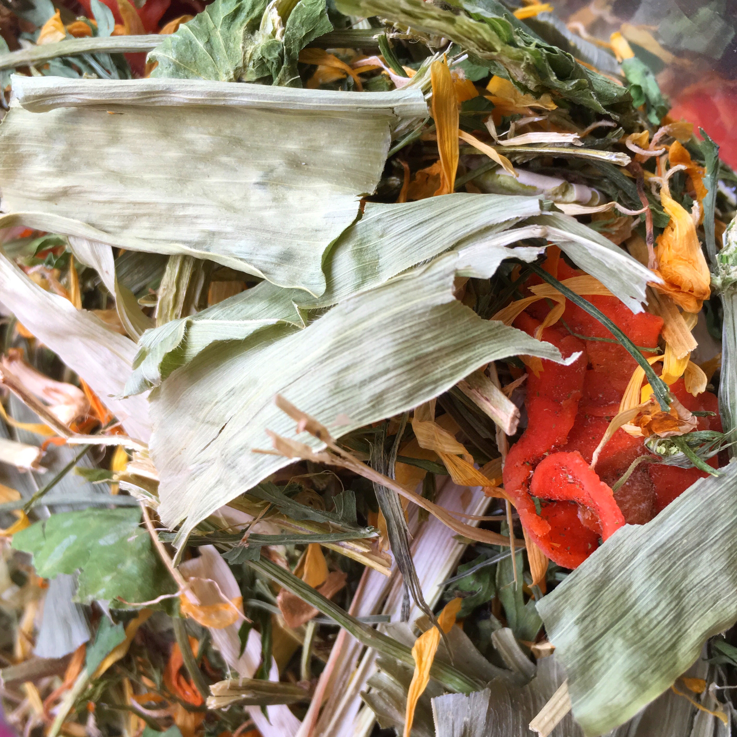 The colours in this mix are great and look very appetising.- The peas and carrot tops are a nice addition but the maize leaves make this mix something really special.