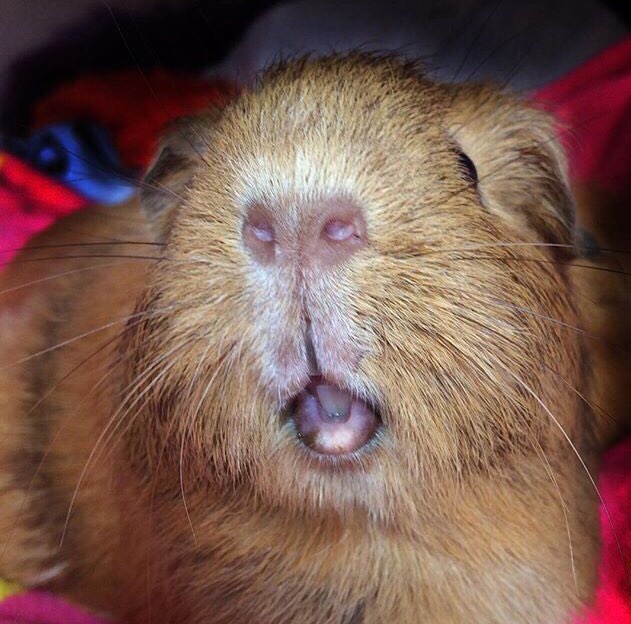 We rescued Morag alongside fellow Squidgypigs Blondie, Miley, Football and Ned (RIP) from a breeding project gone wrong; all sows were heavily pregnant, with overgrown nails, dental problems, various injuries and mud matted into their fur.